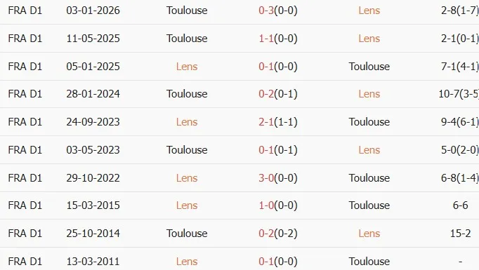 Thống kê phong độ, lịch sử đối đầu của Lens vs Toulouse