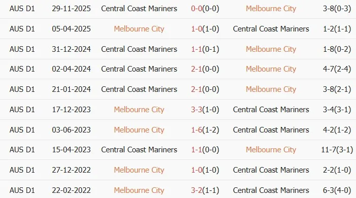 Lịch sử đối đầu giữa Melbourne City và Central Coast Mariners