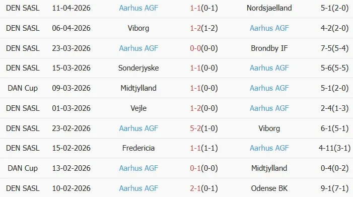 Thống kê phong độ 10 trận đấu gần nhất của Aarhus