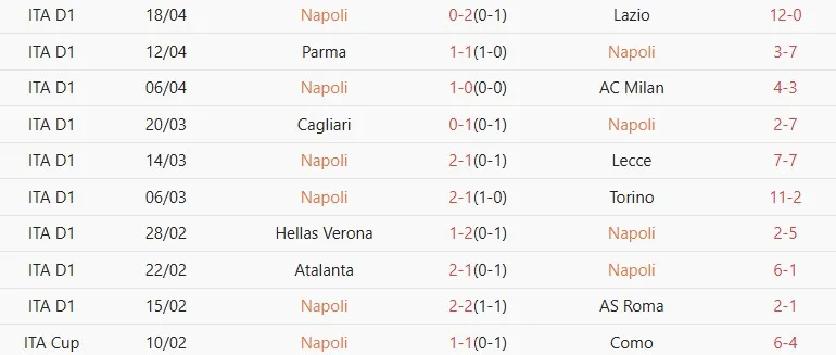 Thống kê phong độ 10 trận đấu gần nhất của Napoli