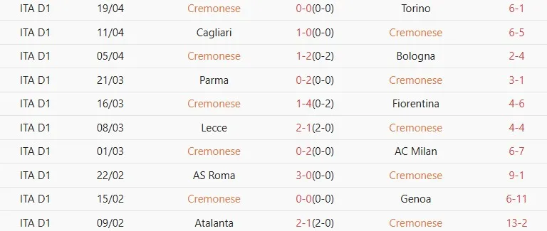 Thống kê phong độ 10 trận đấu gần nhất của Cremonese