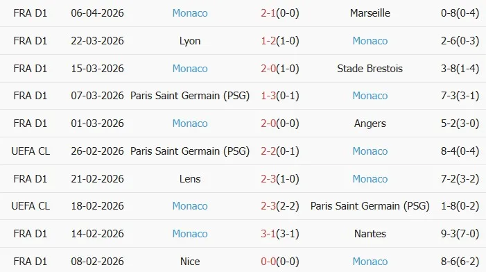 Thống kê phong độ 10 trận gần nhất của AS Monaco