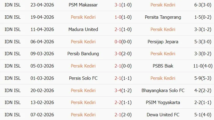 Thống kê phong độ 10 trận đấu gần nhất của Persik Kediri