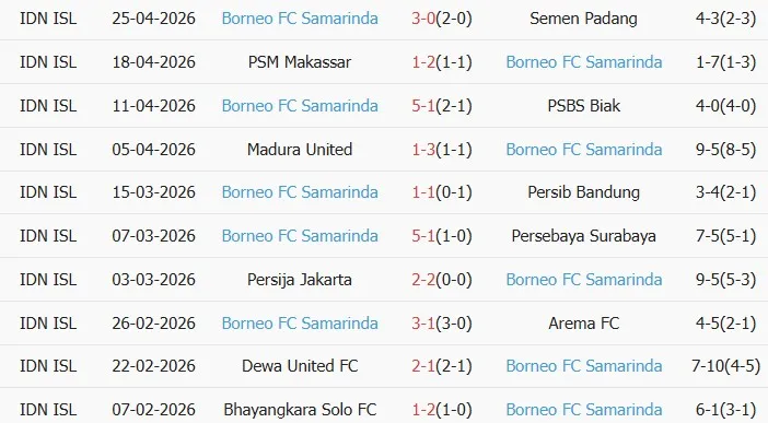 Thống kê phong độ 10 trận đấu gần nhất của Borneo