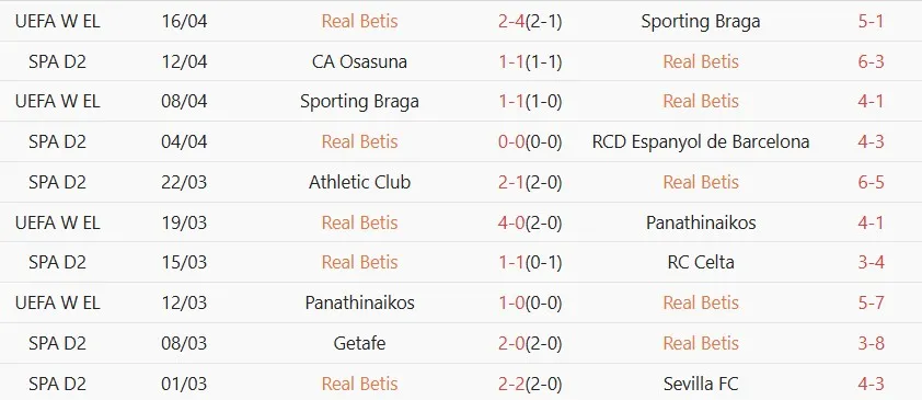 Thống kê phong độ 10 trận đấu gần nhất của Real Betis