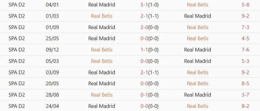 Lịch sử đối đầu Real Betis vs Real Madrid