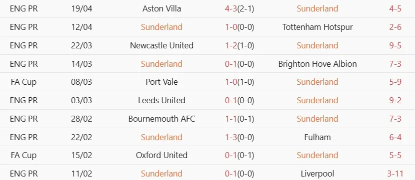 Thống kê phong độ 10 trận đấu gần nhất của Sunderland