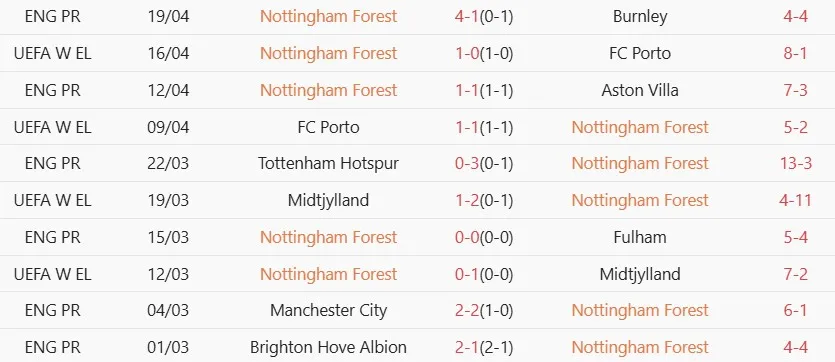 Thống kê phong độ 10 trận đấu gần nhất của Nottingham