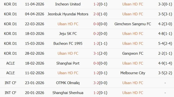 Thống kê phong độ 10 trận gần đây của Ulsan HD