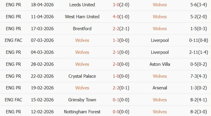 Thống kê phong độ 10 trận đấu gần nhất của Wolves