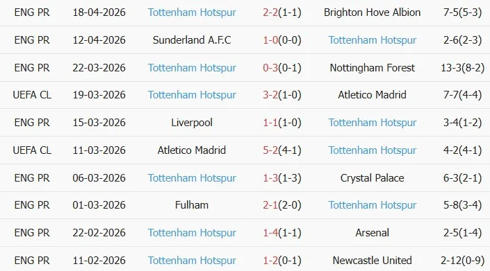 Thống kê phong độ 10 trận đấu gần nhất của Tottenham