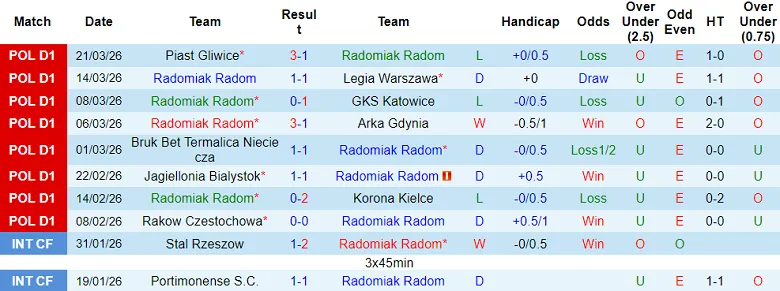 – Thống kê kết quả 10 trận gần nhất của Radomiak Radom