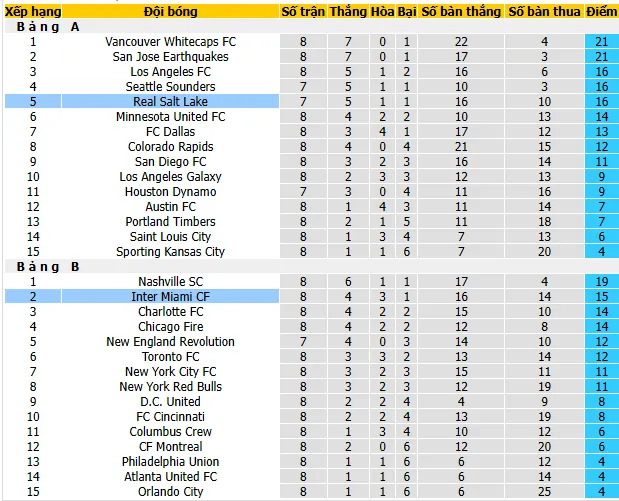 Chiến thắng 4-2 trước San Diego FC đã giúp Salt Lake vươn lên vị trí thứ năm trong bảng xếp hạng miền Tây, trong khi Miami cũng không kém cạnh khi leo lên vị trí thứ hai ở miền Đông nhờ chiến thắng 3-2 trên sân Colorado Rapids.