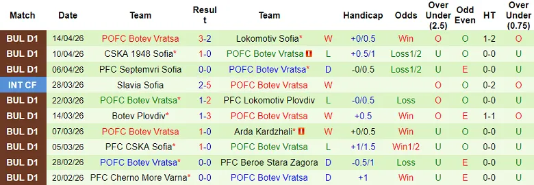– Kết quả 10 trận gần nhất của Botev Vratsa