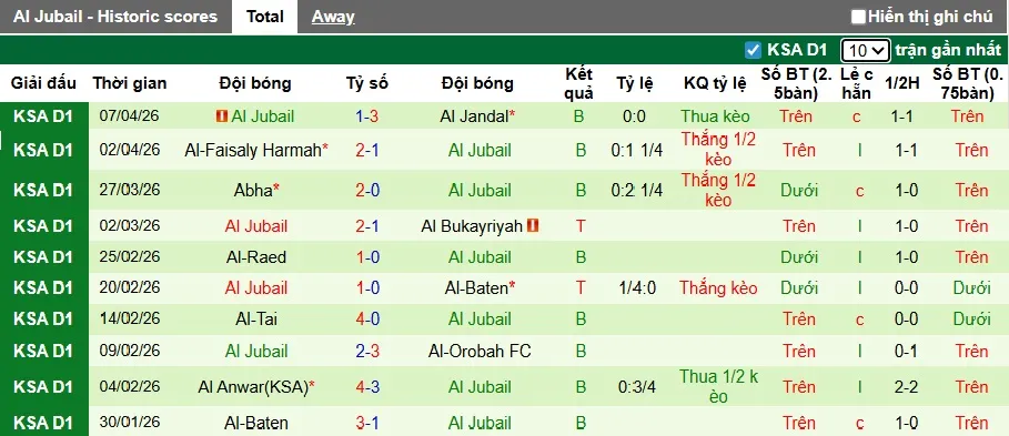 Thống kê phong độ 10 trận đấu gần nhất của Al Jubail.