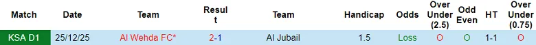 Thống kê phong độ và lịch sử đối đầu giữa Al Jubail và Al Wehda.