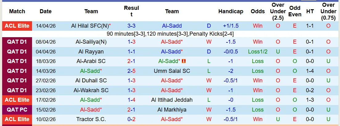 Thống kê phong độ 10 trận đấu gần nhất của Al-Sadd