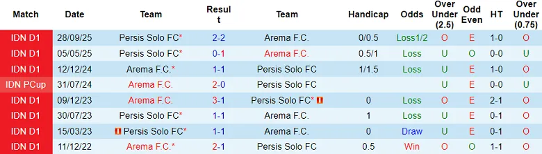 Thống kê phong độ và lịch sử đối đầu giữa Arema và Persis Solo.