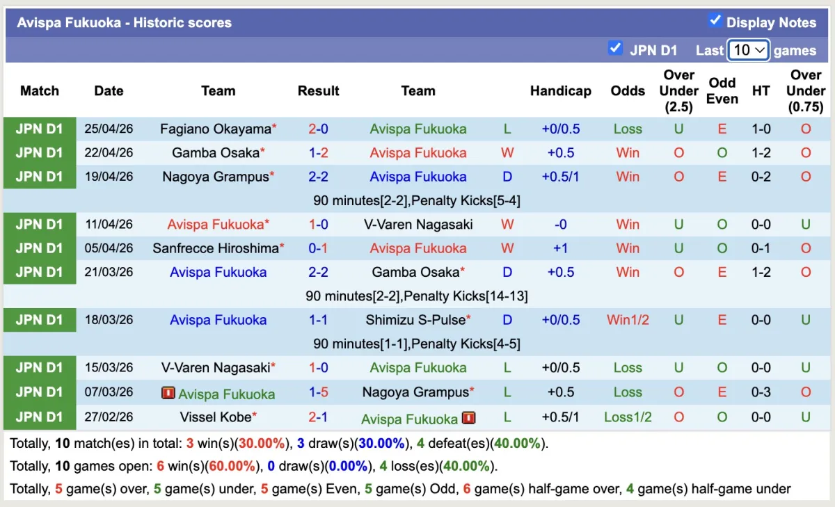 – Thống kê phong độ 10 trận đấu gần nhất của Avispa Fukuoka