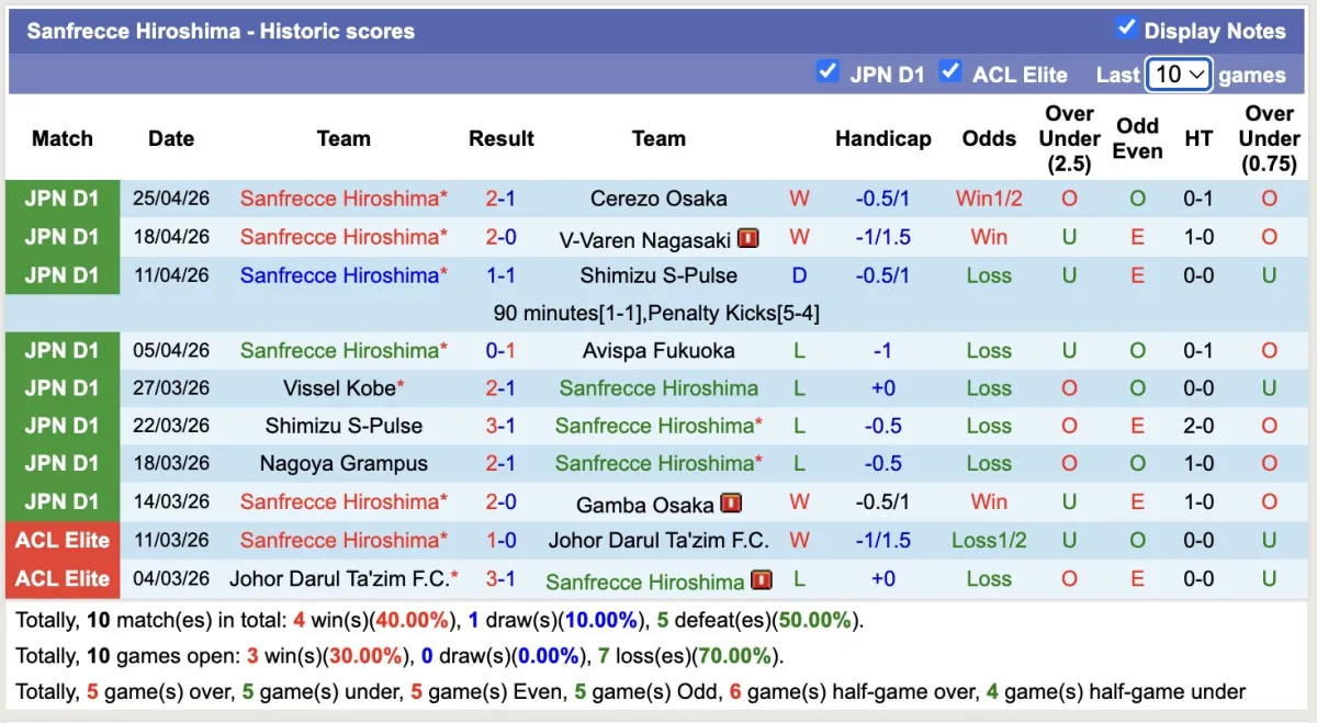 – Thống kê phong độ 10 trận đấu gần nhất của Sanfrecce Hiroshima