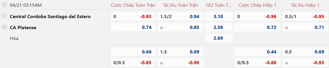 Thành tích gần đây của các cầu thủ Central Cordoba trên sân nhà là khá tốt với việc thắng kèo châu Á trong 4/5 trận gần nhất, trong đó có 1 trận có mức kèo 0:0 tương tự như trận đấu này. Ngược lại, màn trình diễn của Atletico Platense lại khiến các nhà đầu tư thất vọng khi thua kèo châu Á 5/7 trận vừa qua.