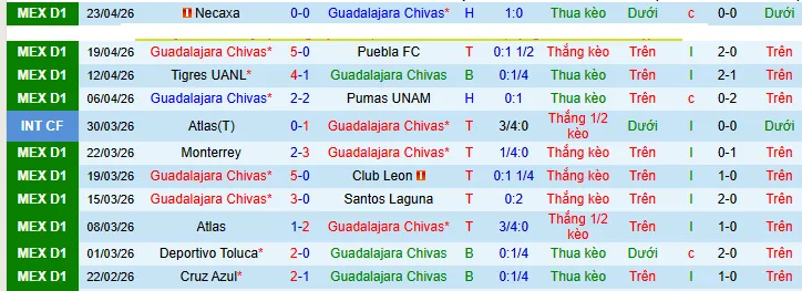 + Guadalajara thắng 1 và thua 3 trong 4 trận gần đây theo kèo châu Á.