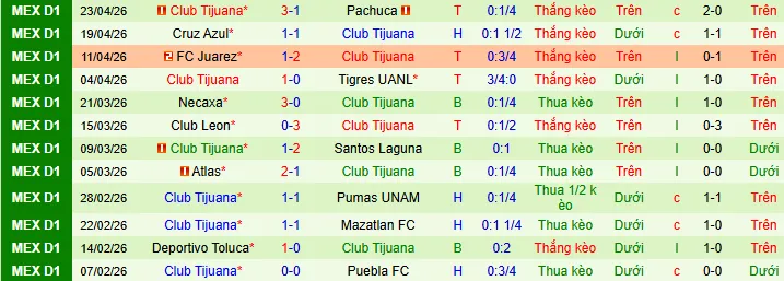 Thống kê phong độ 10 trận đấu gần nhất của Tijuana