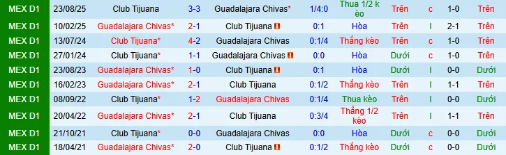 + Trong 4 trận gần nhất trên sân nhà, Guadalajara đều thắng Tijuana với cách biệt đúng 1 bàn (2-1, 1-0, 2-1 và 2-1).