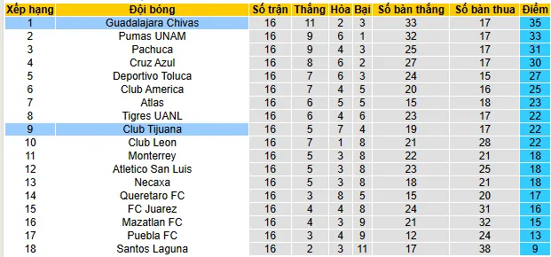 Bảng xếp hạng giải VĐQG Mexico 2025/26