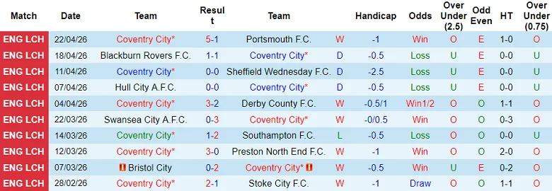 – Thống kê kết quả 10 trận gần nhất của Coventry.