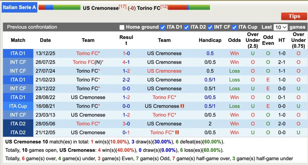 Tỉ lệ thắng kèo của Cremonese trong mùa giải này chỉ đạt 37.5%, đứng thứ 4 từ dưới lên trong bảng xếp hạng. Ngược lại, tỉ lệ thắng kèo của Torino cao hơn nhiều, lên tới 53.13%. Trong 6 trận đấu gần nhất, đội khách chưa từng thua kèo và đã thắng đến 5 lần, cho thấy họ có khả năng sáng cửa ở kèo châu Á.