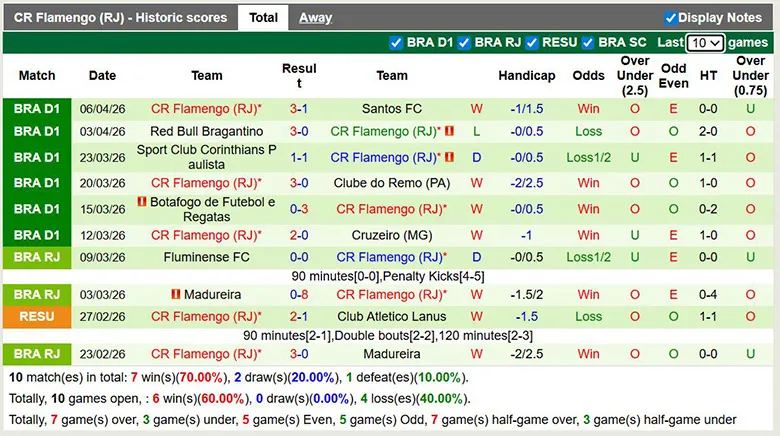 – Thống kê phong độ 10 trận đấu gần nhất của Flamengo
