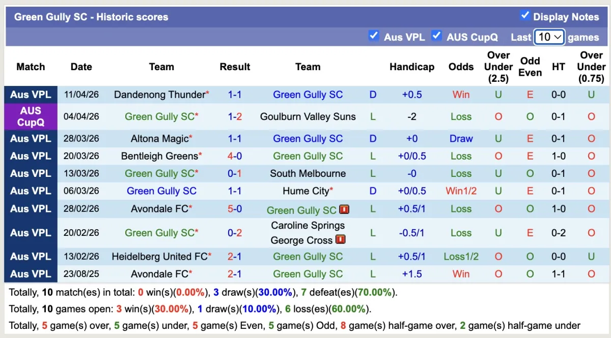 -Thống kê phong độ 10 trận đấu gần nhất của Green Gully SC