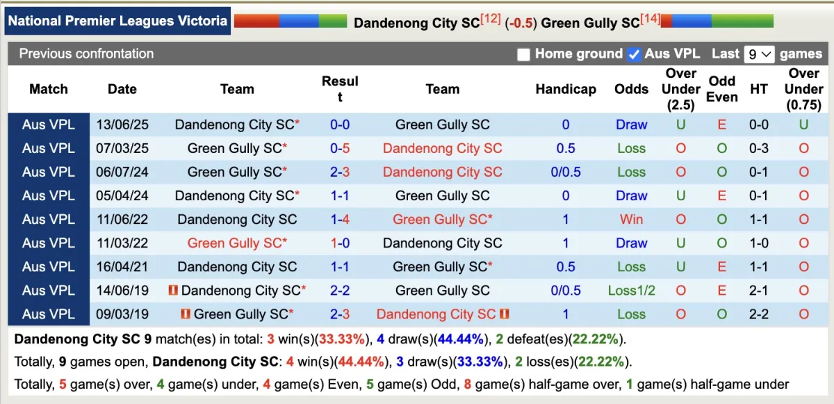 Trong 3 lần chạm trán gần nhất giữa hai đội, Dandenong City SC chưa từng thua kèo và đã có 2 lần thắng kèo. Ở vòng đấu gần đây, đội bóng này đã trở lại với một chiến thắng thuyết phục 3-0 và vượt qua được kèo Handicap. Trong khi đó, Green Gully SC đã không thắng kèo trong 7/9 trận liên tiếp, vì vậy đội chủ nhà được xem là lựa chọn đáng tin cậy ở kèo châu Á.