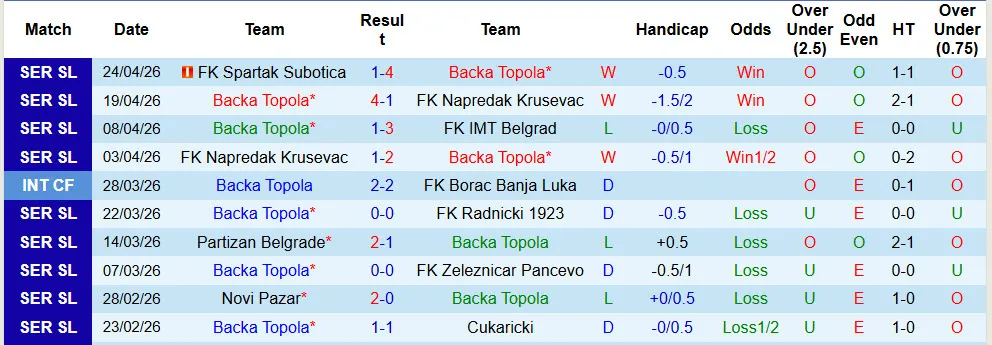 Thống kê phong độ 10 trận đấu gần nhất của Backa Topola