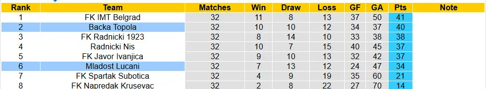 Thống kê phong độ, lịch sử đối đầu của Backa Topola vs Mladost Lucani