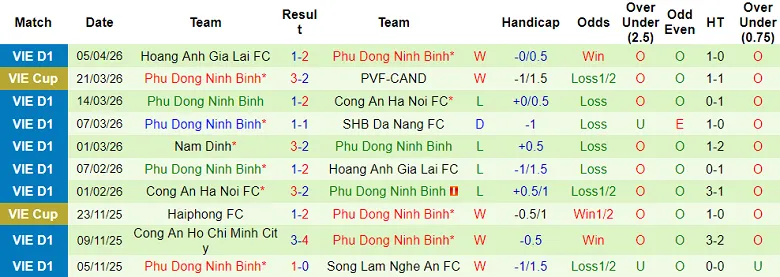 – Thống kê kết quả 10 trận gần nhất của Ninh Bình.