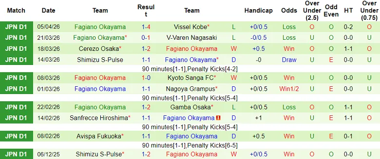 – Thống kê phong độ 10 trận gần nhất của Fagiano Okayama.