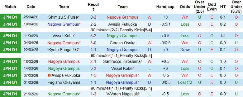 – Kết quả 10 trận gần đây nhất của Nagoya Grampus