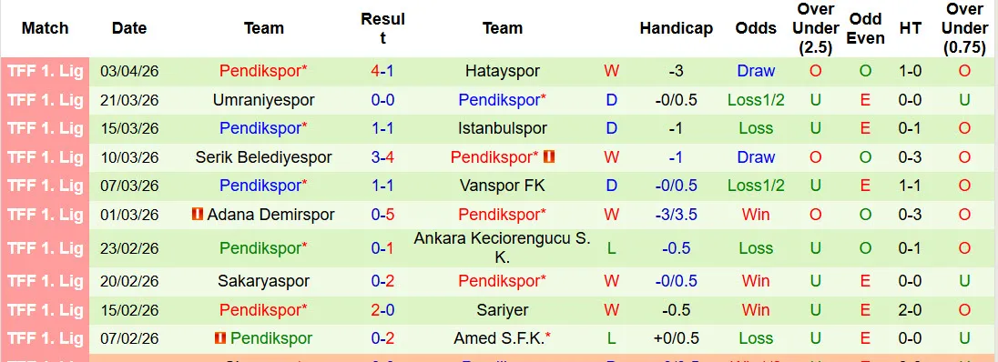 Thống kê phong độ 10 trận gần nhất của Pendikspor