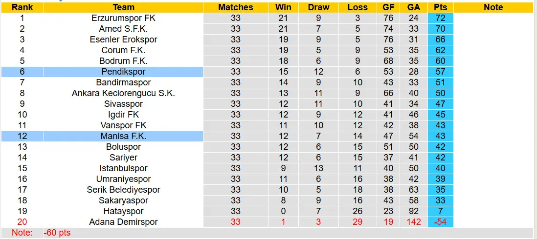 Trong trận đấu tối nay, Manisa sẽ tiếp đón Pendikspor trên sân nhà và khả năng cao rằng chuỗi trận thua của đội bóng này sẽ tăng lên con số 4. Cần lưu ý rằng, Pendikspor hiện đang nằm trong top 5 trên bảng xếp hạng và đang hướng tới một suất thăng hạng lên giải VĐQG Thổ Nhĩ Kỳ mùa tới. Đội bóng này đang trong nhóm có khả năng đá play-off thăng hạng và vẫn đang duy trì phong độ ổn định. Cụ thể, họ vừa trải qua 6 trận đấu bất bại tại giải hạng Nhất.