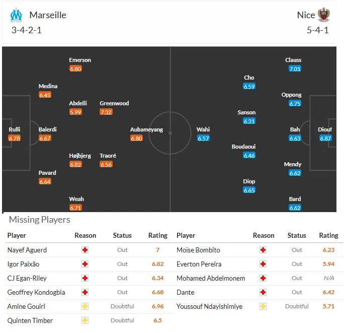 Marseille không thắng tới 7 trong số 11 trận gần nhất gặp Nice. Tuy nhiên, họ bất bại trong 7 trong số 8 trận sân nhà gần đây ở mọi giải đấu. Nice cũng đang có chuỗi 3 trận bất bại, trong đó có 2 trận hòa tại giải VĐQG Pháp.
