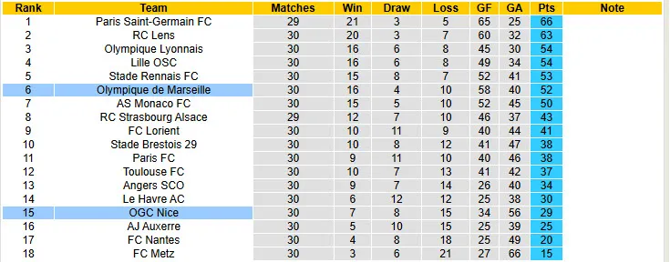 Đêm nay, mặc dù có lợi thế sân nhà, nhưng với phong độ thất thường hiện tại, Marseille không phải là lựa chọn được giới mộ điệu đặt nhiều niềm tin vào khả năng giành chiến thắng. Cần nhắc lại rằng, họ đã thua tới 3 trong số 4 trận gần đây tại giải VĐQG Pháp. Nhìn sang đối thủ, Nice đang xếp ở vị trí thứ 15 trên bảng xếp hạng, thấp hơn Marseille. Đây là vị trí ngay trên nhóm xuống hạng, nhưng không có nghĩa là Nice là đối thủ dễ bị xem thường. Đội bóng đến từ Nice đang cho thấy sự cải thiện đáng khen khi hòa Lille và Le Havre trong hai vòng đấu gần nhất tại giải VĐQG. Gần đây, Nice cũng đã có một chiến thắng quan trọng trước Strasbourg tại bán kết cúp QG Pháp. Với tâm lý đang lên, Nice tự tin có thể giành điểm trước Marseille và duy trì vị trí an toàn trong giải VĐQG.