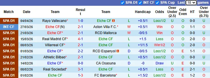 Thống kê phong độ 10 trận gần nhất của Elche