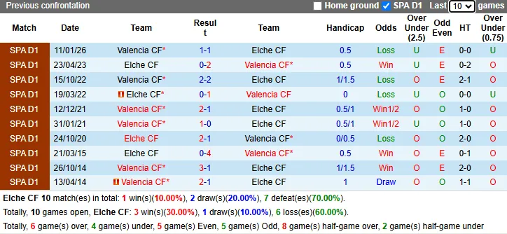 Thống kê phong độ, lịch sử đối đầu Elche vs Valencia