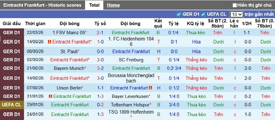 Thống kê phong độ 10 trận đấu gần nhất của Frankfurt