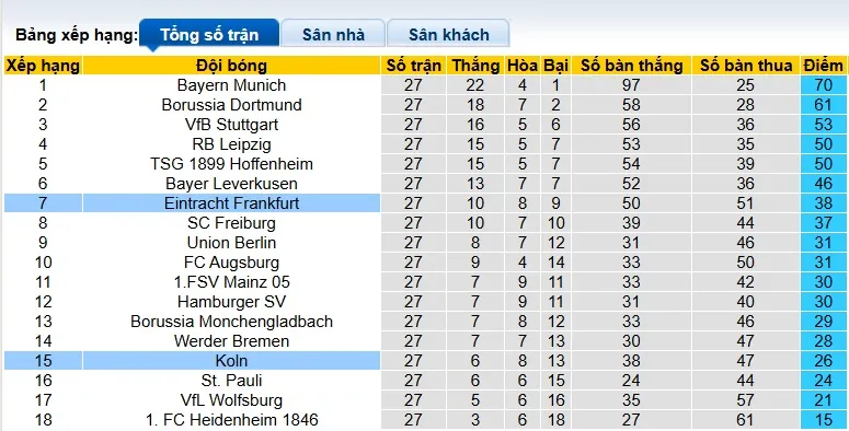 Thống kê phong độ, lịch sử đối đầu của Frankfurt vs Cologne