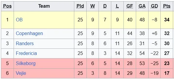 Bảng xếp hạng giải VĐQG Đan Mạch