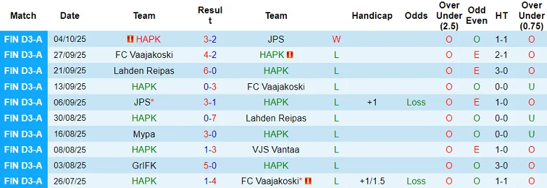 Trong 6 trận gần đây, có tới 5 trận ghi từ 4 bàn thắng trở lên. Kịch bản quen thuộc này dự kiến sẽ tiếp tục diễn ra khi HaPK và SJK Seinajoki thi đấu tại vòng 3 giải Suomen Cup 2026.