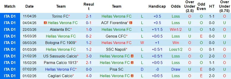 – Kết quả 10 trận gần nhất của Hellas Verona.